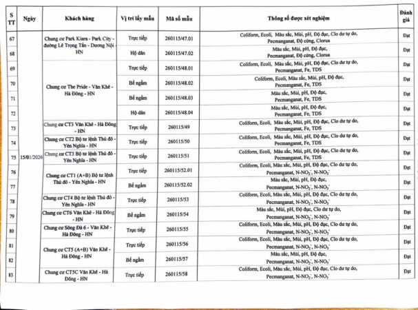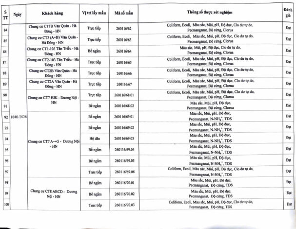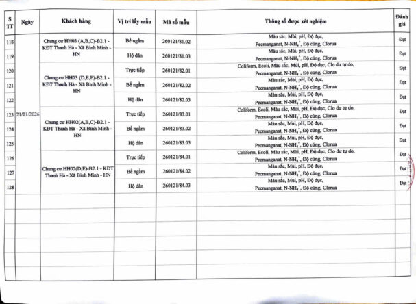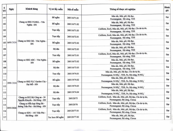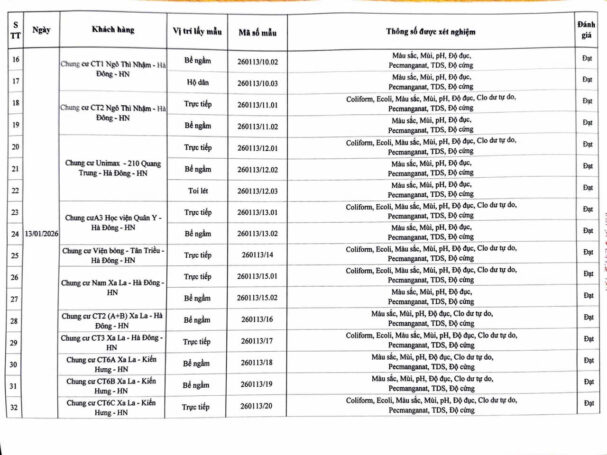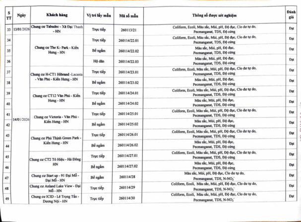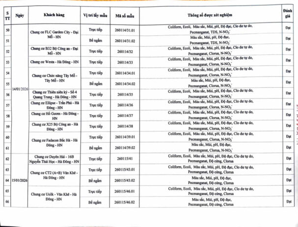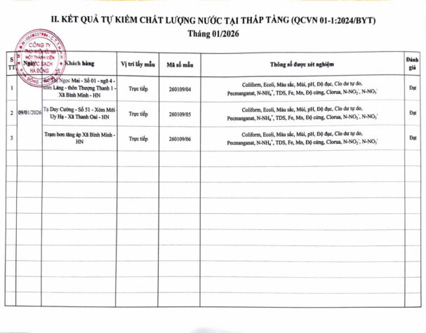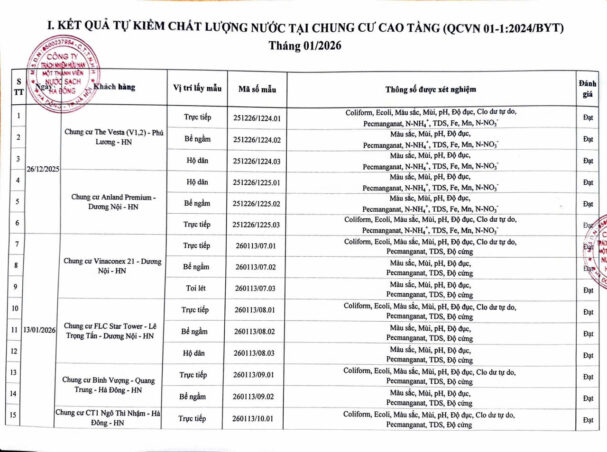 KẾT QUẢ NỘI KIỂM CHẤT LƯỢNG NƯỚC CÁC CƠ SỞ TRONG THÁNG 1 NĂM 2026 (Các kết quả khác) Posted on 30 Tháng Một, 2026 By Hoang Yen Kết quả nội kiểm chất lượng nước tại Chung cư cao tầng (QCVN 01-1:2024/BYT)Kết quả nội kiểm chất lượng nước tại Thấp tầng (QCVN 01-1:2024/BYT)