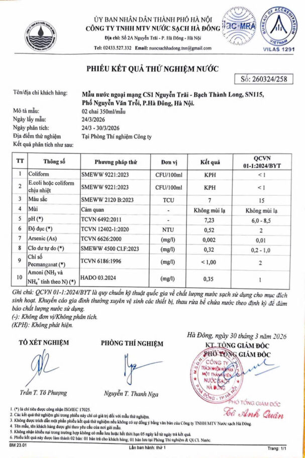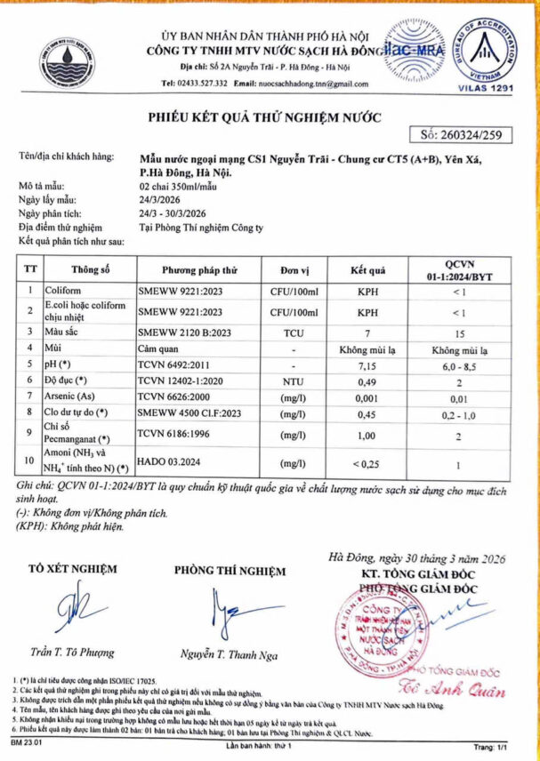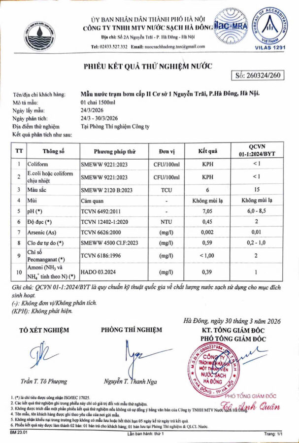 Kết quả nội kiểm chất lượng mẫu nước trạm bơm cấp II cơ sở 1 Nguyễn Trãi, phường Hà Đông, Hà Nội