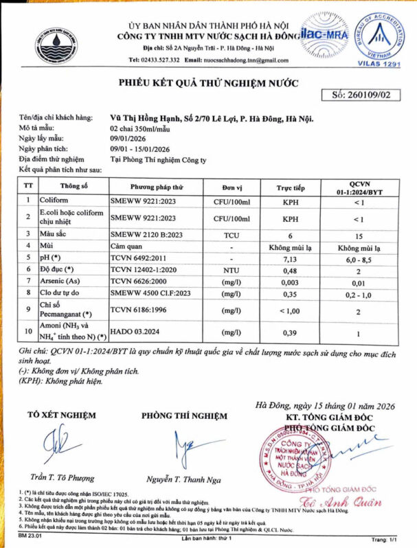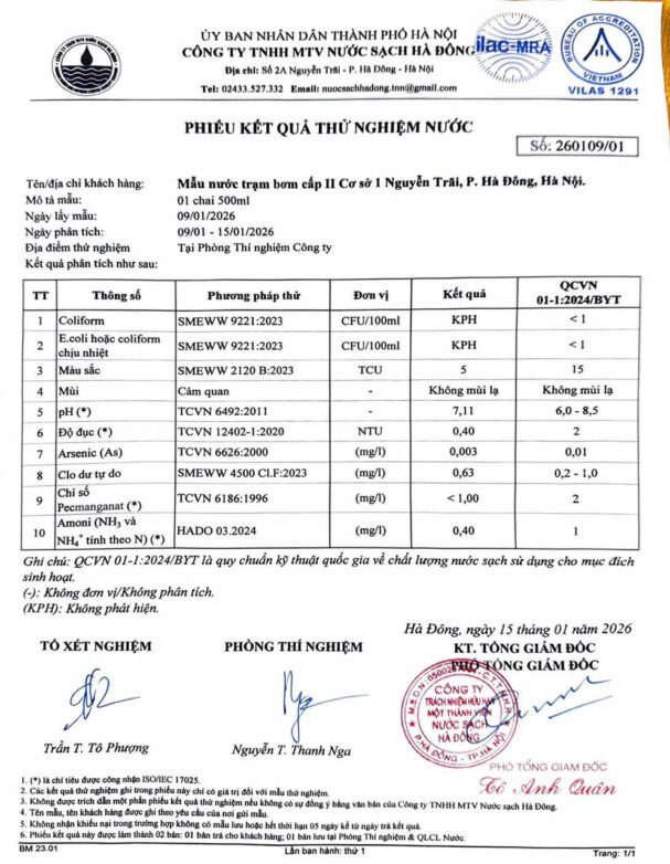 KẾT QUẢ NỘI KIỂM CHẤT LƯỢNG NƯỚC CÁC CƠ SỞ TRONG THÁNG 1 NĂM 2026 (Các kết quả khác) Posted on 15 Tháng Một, 2026 By Hoang Yen Kết quả nội kiểm chất lượng mẫu nước trạm bơm cấp II Cơ sở 1 Nguyễn Trãi, phường Hà Đông, Hà Nội Kết quả nội kiểm chất lượng mẫu nước ngoại mạng cơ sở 1 Nguyễn Trãi