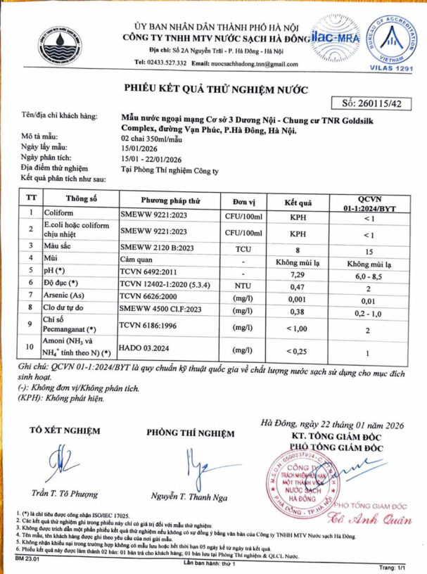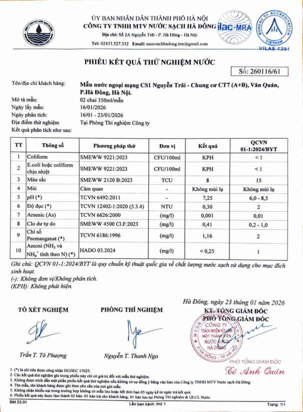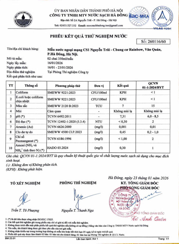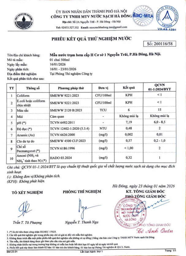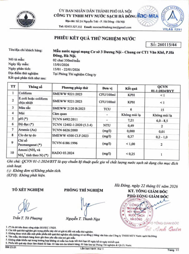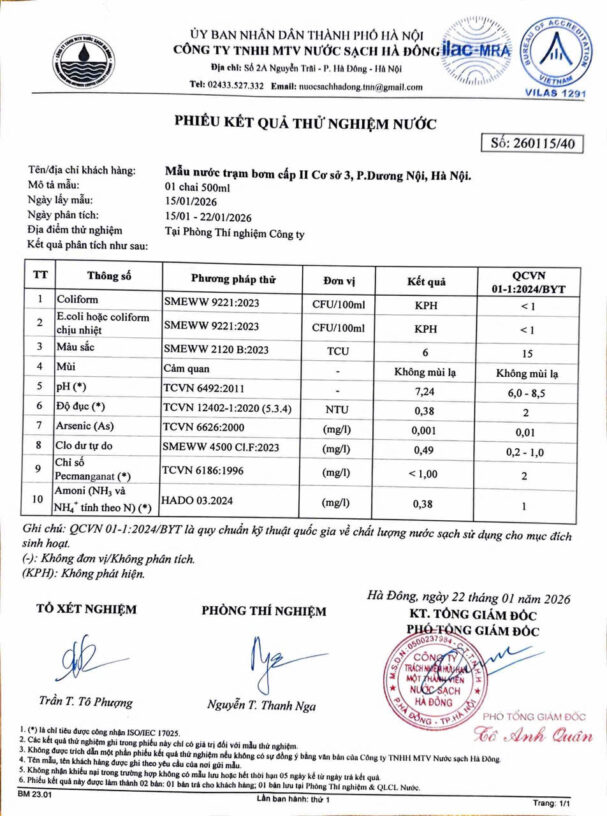KẾTN QUẢ NỘI KIỂM CHẤT LƯỢNG NƯỚC CÁC CƠ SỞ TRONG THÁNG 1 NĂM 2026 (Cơ sở 3) Posted on 26 Tháng Một, 2026 By Hoang Yen Kết quả nội kiểm chất lượng mẫu nước trạm bơm cấp II Cơ sở 3, phường Dương Nội, Hà NộiKết quả nội kiểm chất lượng mẫu nước ngoại mạng Cơ sở 3 Dương Nội
